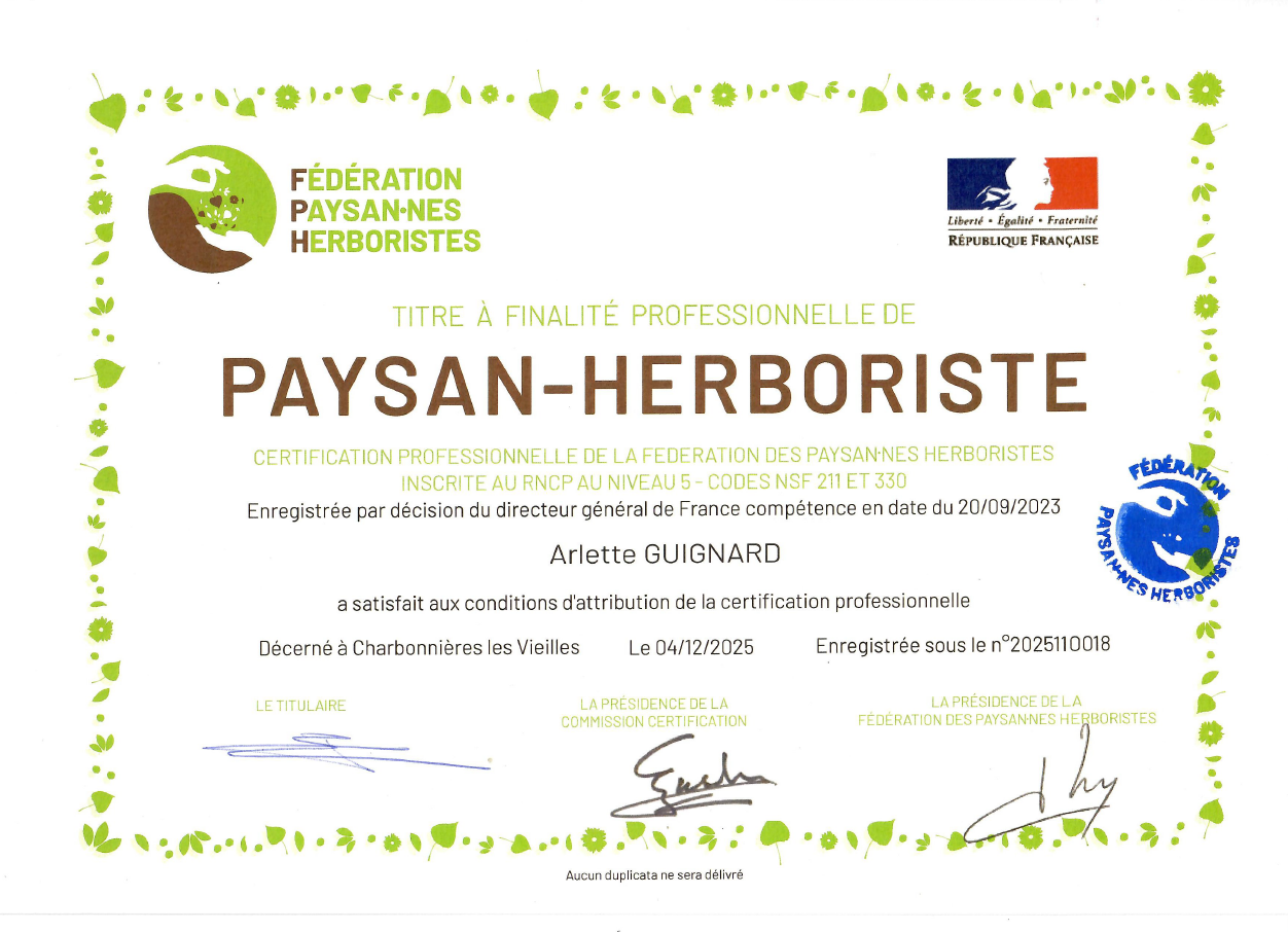 10 ans après la formation de 2 ans à l’école d’herboristerie et l’obtention du certificat d’études à la connaissance et l’usage des plantes aromatiques et médicinales, Arlette a passé, fin 2025, une VAE (Validation des Acquis d’Expérience) qui a abouti au diplôme de Paysan-herboriste reconnu par l’état depuis 2023.