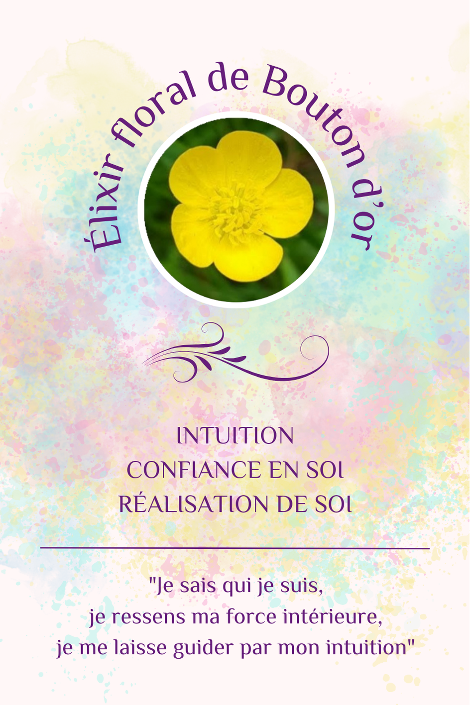 L’élixir floral de Bouton d’Or permet de devenir indépendant et de développer une meilleure conscience de notre valeur personnelle. Il efface les sentiments d’infériorité ou d’incapacité, les peurs de l’échec, en favorisant une meilleure image de Soi.