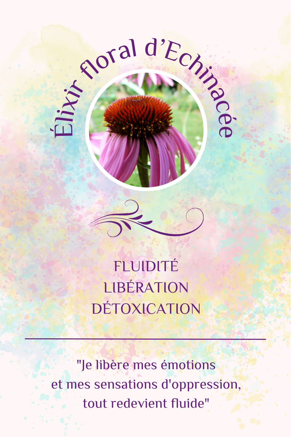 L’élixir floral d’Echinacée possède une action libératrice, désintoxiquante et énergisante. Les défenses physiques sont stimulées énergétiquement. Il libère les charges émotionnelles au niveau du quatrième chakra (cœur), les sensations d’oppressions ou de rétention.