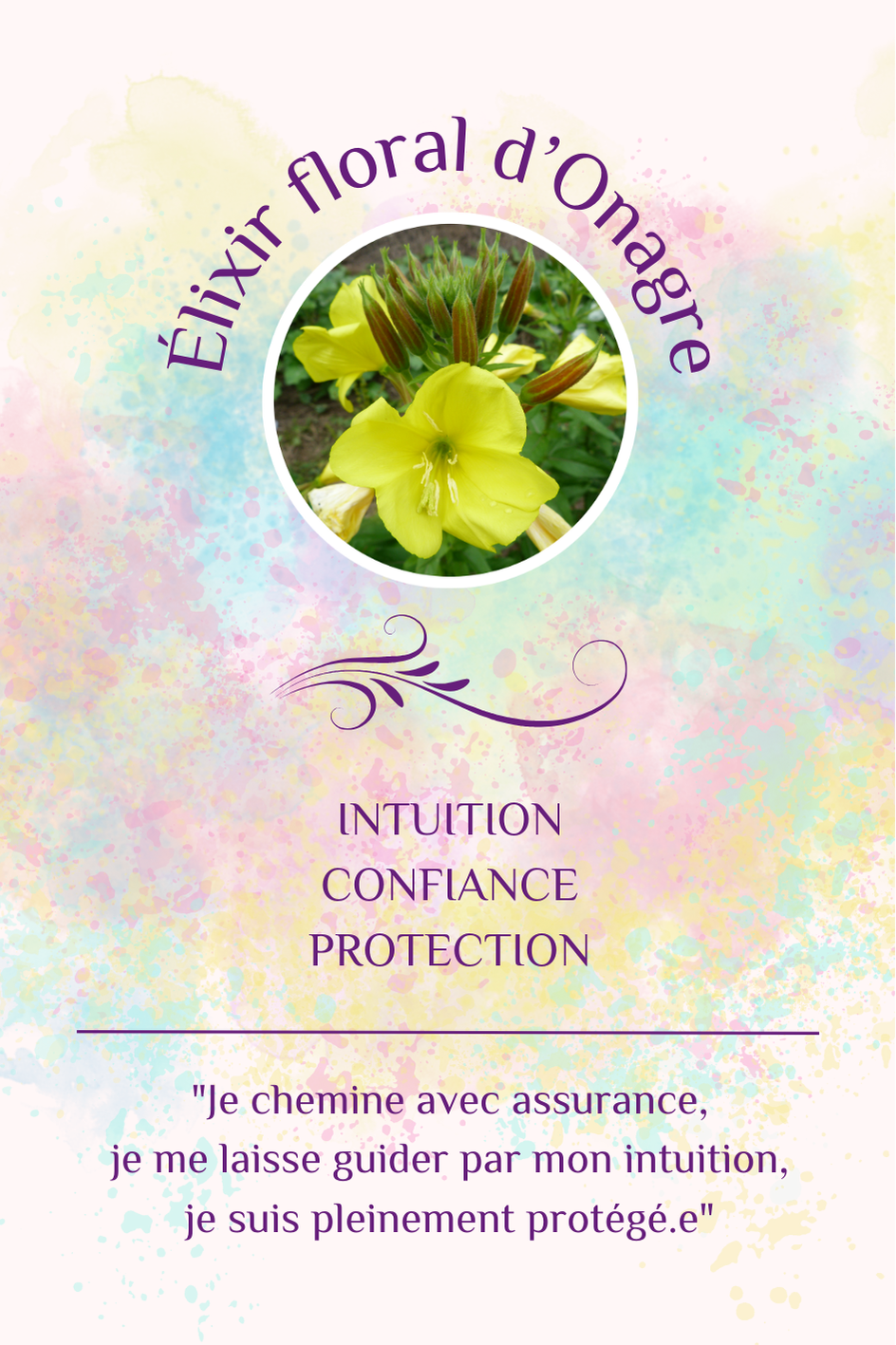 L’élixir floral d’Onagre soutient le mental en apportant la lumière dans l’obscurité des angoisses. Il apaise et adoucit l’âme, l’esprit et le corps.