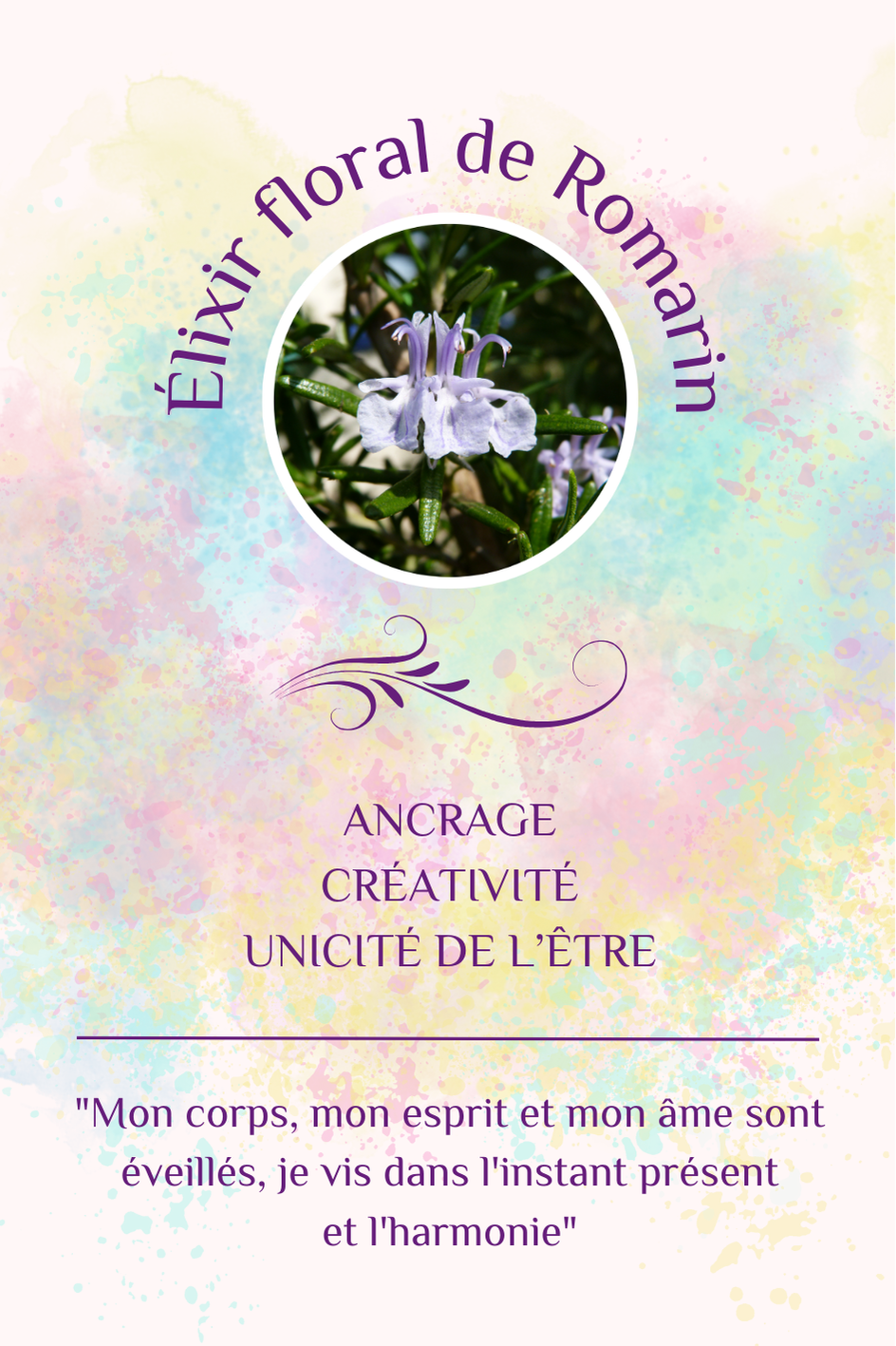 L’élixir floral de Romarin nous aide à être ici et maintenant; Il favorise la concentration, éveille le mental et renforce la mémoire. Il aide à être pleinement dans son corps physique en ramenant l’âme sur Terre (idéal pour les nouveau-nés, surtout les prématurés).